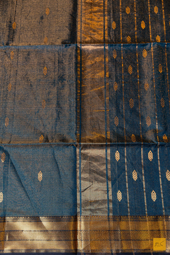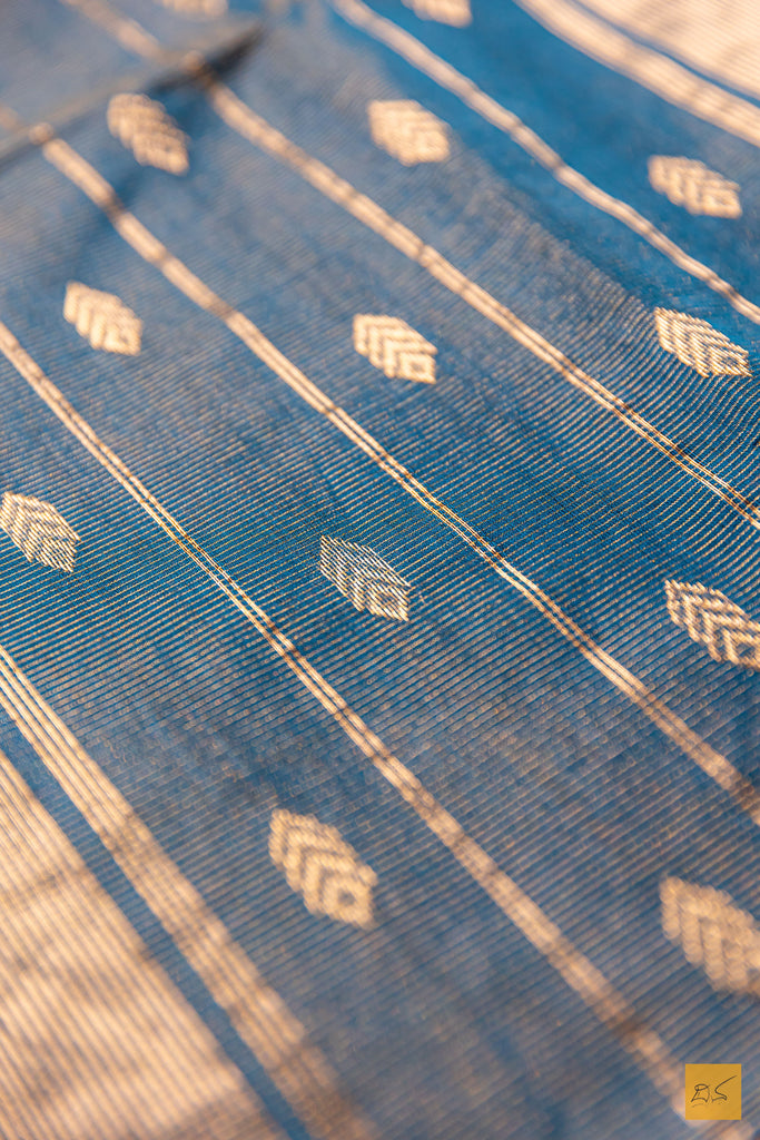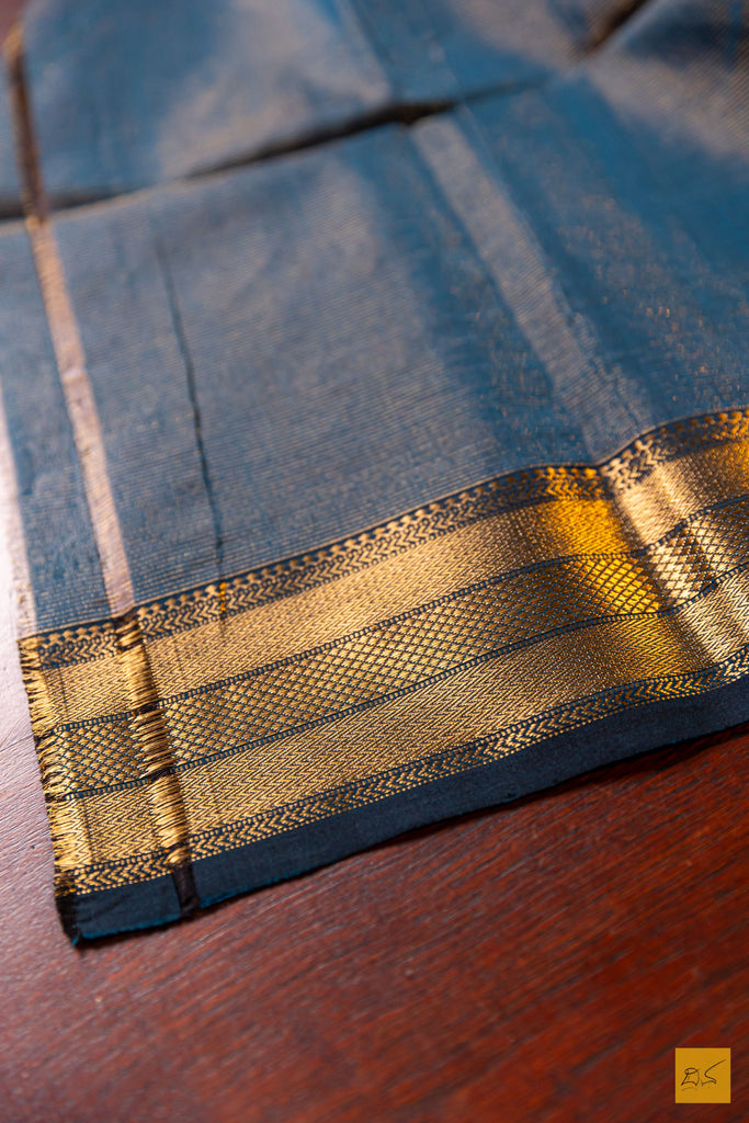 The Geetha – Peacock Green Tissue Maheshwari Silk Cotton Handwoven Saree is a radiant blend of tradition and elegance. Handwoven in the heritage town of Maheshwar, this saree is crafted from a fine silk-cotton tissue blend that offers a lightweight feel with a subtle sheen. The rich peacock green body is adorned with delicate butta motifs, while the shimmering zari border adds a touch of festive grandeur. Paired with a matching running blouse, this saree is perfect for celebrations, weddings, and special occasions, reflecting timeless craftsmanship with a graceful finish.