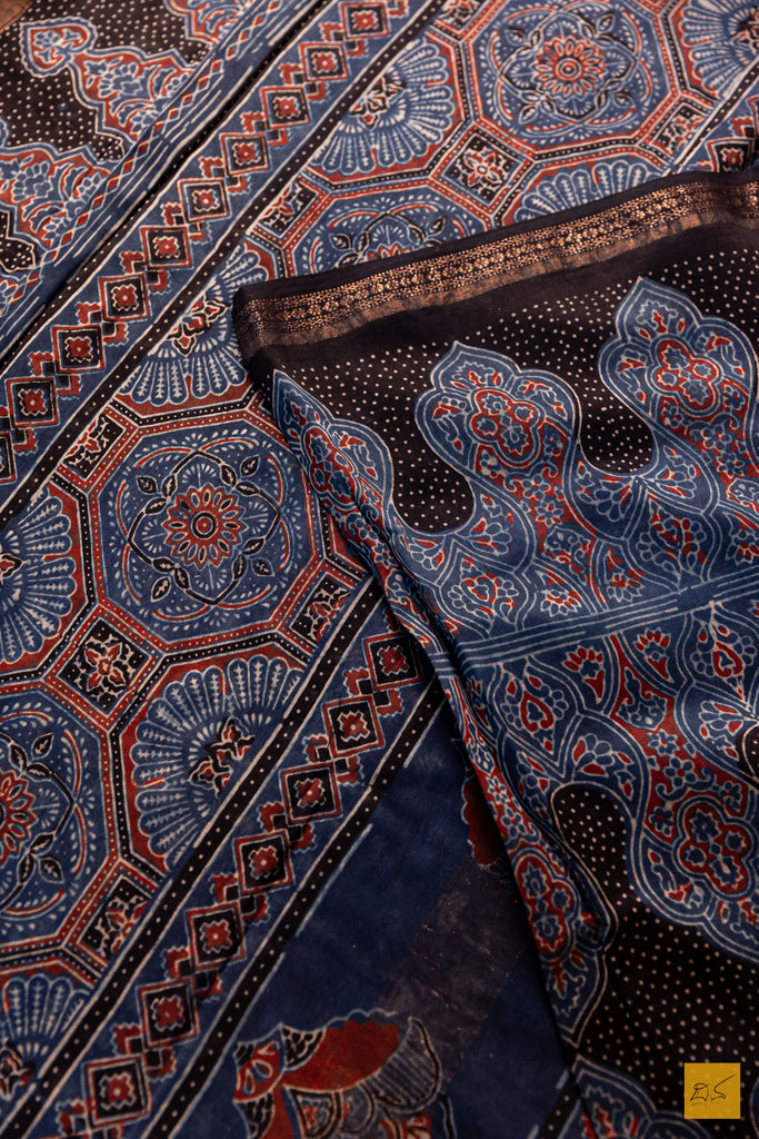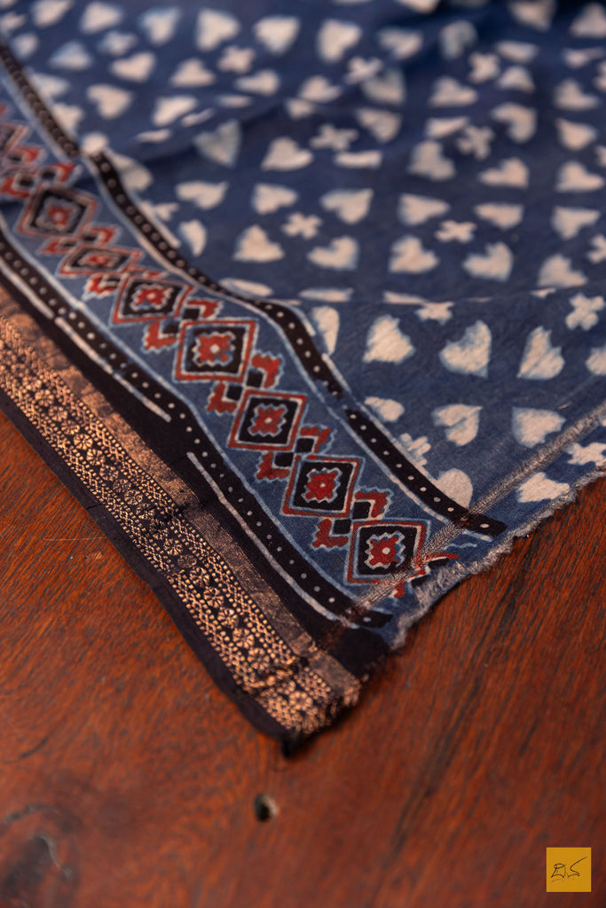 Shivangi- Blue Maheshwari Silk Cotton Ajrakh Print Handwoven Saree
