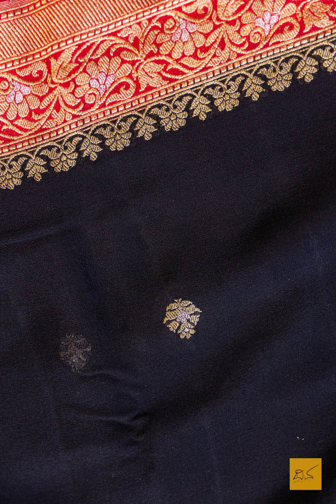 Elevate your ethnic wardrobe with Urvi, a captivating black Banarasi georgette handwoven saree featuring delicate Sona Rupa floral buttas that shimmer with subtle elegance. The striking red border adds a bold contrast, enhancing the saree’s regal allure. Crafted with finesse, this saree drapes beautifully and offers a graceful silhouette. Paired with a plain blouse accented by a matching red border, Urvi is the epitome of timeless sophistication and royal charm — perfect for festive occasions, weddings, or elegant evening events.