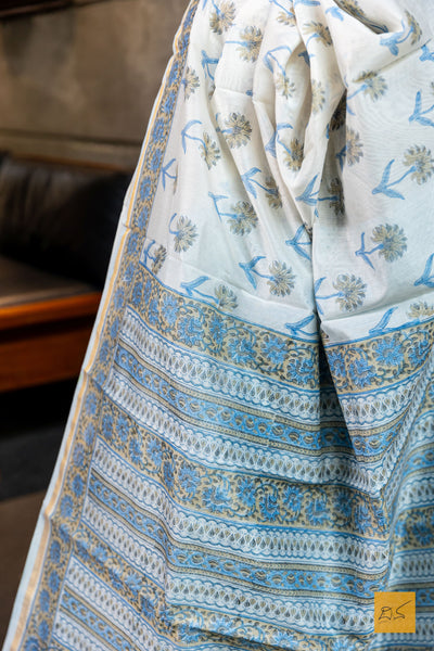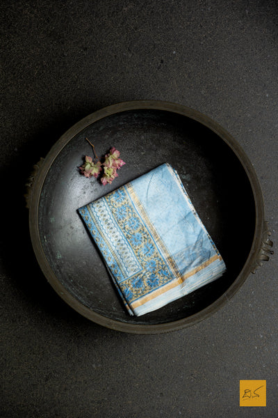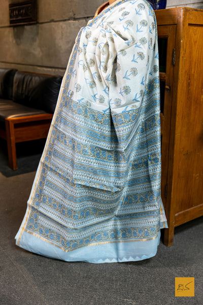 Experience the luxury of Sahiti- a hand block printed saree in sky blue adorned with a delicate print, crafted from the finest chanderi silk cotton.