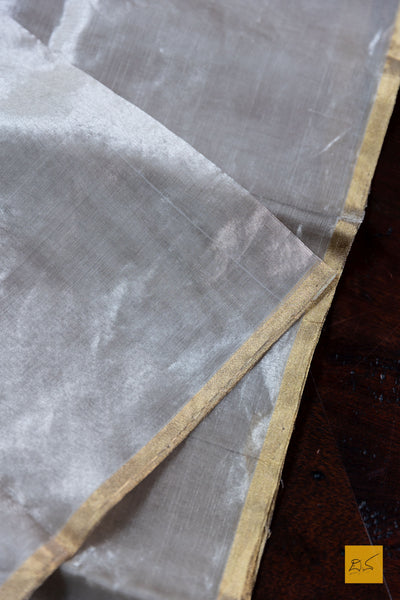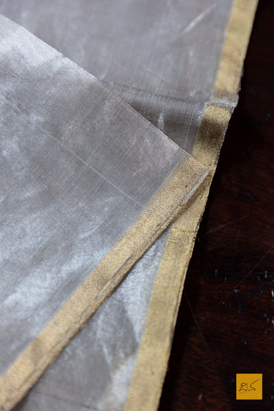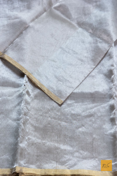 Introducing the exquisite Sunaina - Silver Chanderi Tissue Handwoven Saree, a masterpiece of handwoven craftsmanship and elegant design. Made from high-quality materials, this saree is a stunning addition to anyone's wardrobe. Sheer and beautiful