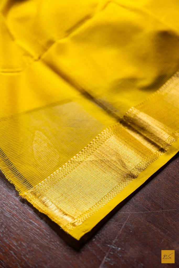 The Apoorva Yellow Maheshwari Silk Cotton Handwoven Saree is a cheerful and elegant piece, meticulously crafted using the Garbh Reshmi weaving technique. Featuring a bright yellow body complemented by a golden border, it radiates warmth and sophistication. Paired with a matching running blouse, this saree offers an airy, lightweight drape, making it perfect for festive occasions, daytime events, or casual celebrations where comfort meets timeless style.