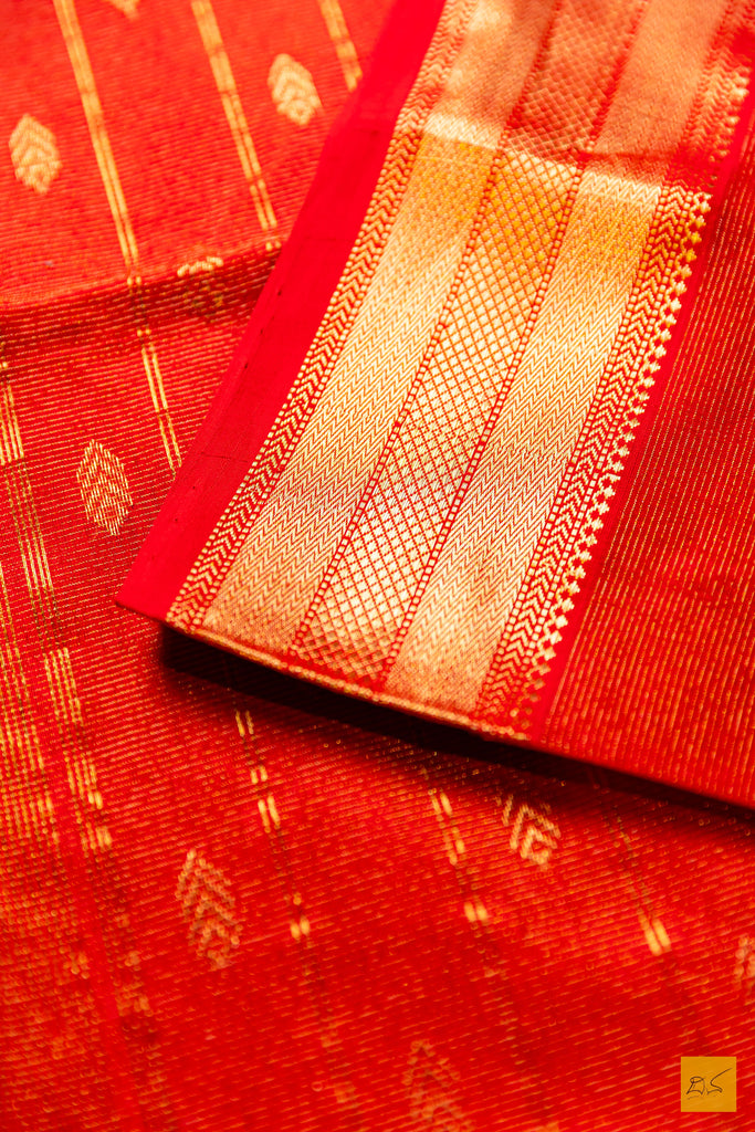The Deepthi – Red Tissue Maheshwari Silk Cotton Handwoven Saree is a striking celebration of heritage and elegance. Handwoven in the historic town of Maheshwar, this saree showcases the finesse of traditional Maheshwari craftsmanship. Crafted from a luxurious silk-cotton tissue blend, it features a luminous red body adorned with delicate butta motifs that add texture and charm. The graceful zari border enhances its richness with a subtle shimmer, creating a perfect festive appeal. Paired with a matching running blouse, this saree is ideal for weddings, celebrations, and special occasions, embodying timeless beauty with a regal touch.