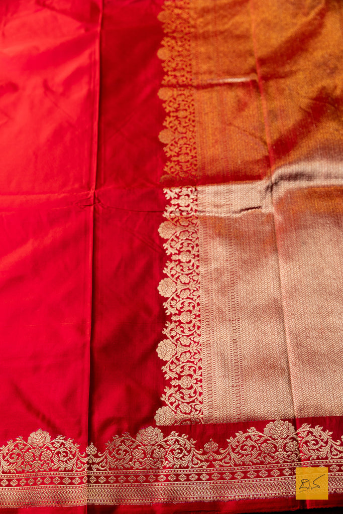 Pavana brings a fresh vibe to traditional elegance with its vibrant red Banarasi satin silk fabric, accentuated by a chic contemporary floral border. The rich texture pairs beautifully with a detailed brocade blouse, creating a look that’s both timeless and fashion-forward. Perfect for those who want to honor classic craftsmanship while making a stylish statement.
