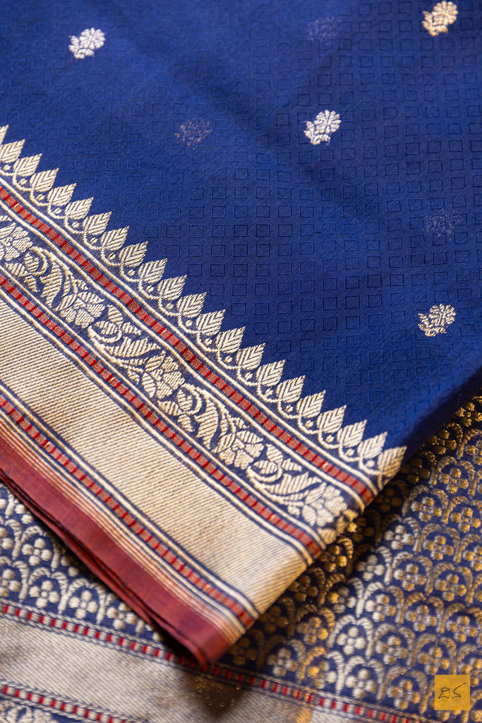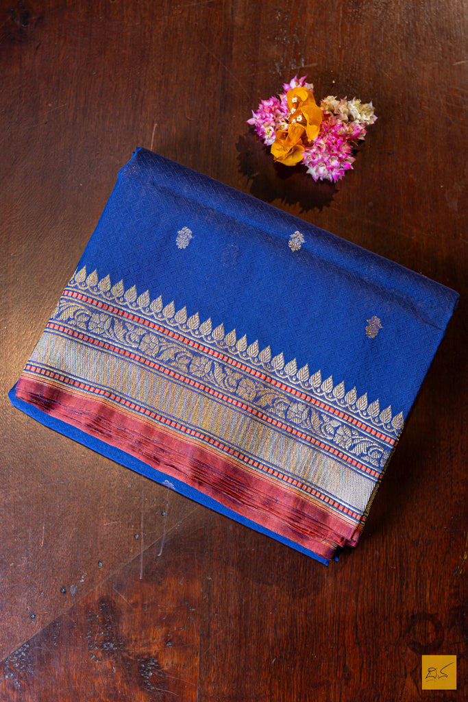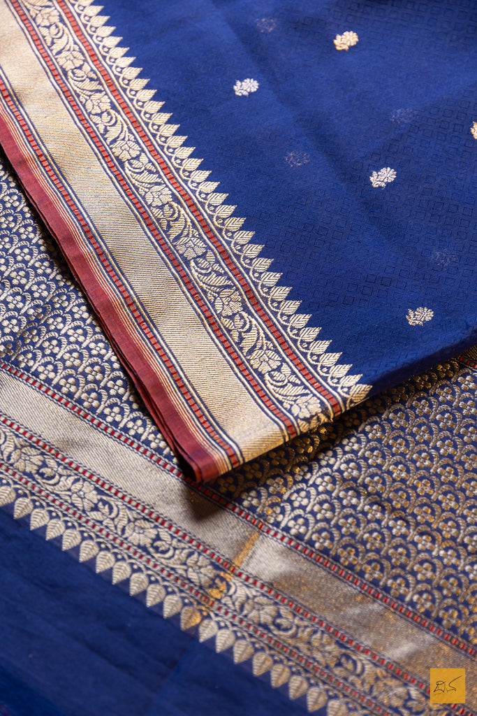 Prabha – Blue Banarasi Pure Cotton Handwoven Saree is a graceful blend of simplicity and traditional charm. Woven in soft, breathable cotton, the saree features delicate sona-rupa small buttas spread across the body, adding subtle elegance. The traditional border frames the saree beautifully, enhancing its classic appeal. Perfect for casual gatherings or festive occasions, this saree reflects the timeless artistry and heritage of Banarasi handloom craftsmanship.