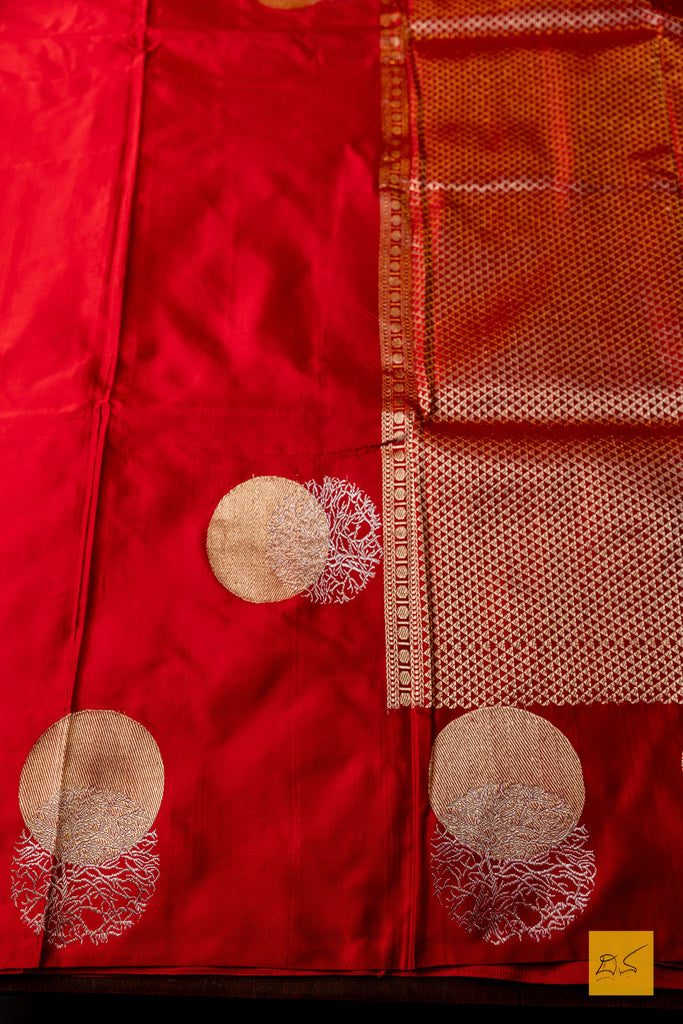 Pushkari is a captivating red Banarasi satin silk saree that beautifully marries traditional artistry with modern design. Featuring a sleek contemporary border, this handwoven saree highlights the rich texture and elegance of Banarasi silk. Intricate Kadhwa work adds depth and heritage charm, while the luxurious brocade blouse completes the look with a touch of regal sophistication. Perfect for those who appreciate a blend of classic craftsmanship and contemporary style.