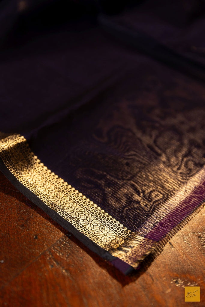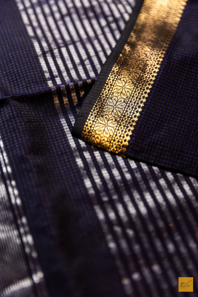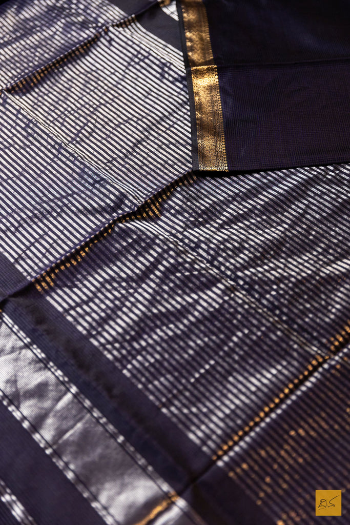 The Srikala Black Maheshwari Silk Cotton Handwoven Saree is a graceful creation crafted using the traditional Garbh Reshmi weaving technique, known for its fine texture and refined finish. The saree features a rich black body accentuated by a small golden zari border, exuding timeless sophistication. Its silver-striped pallu adds a subtle contemporary touch while maintaining a classic aesthetic. Lightweight and elegant, this handwoven masterpiece perfectly blends heritage craftsmanship with modern appeal, making it ideal for festive and formal occasions alike.
