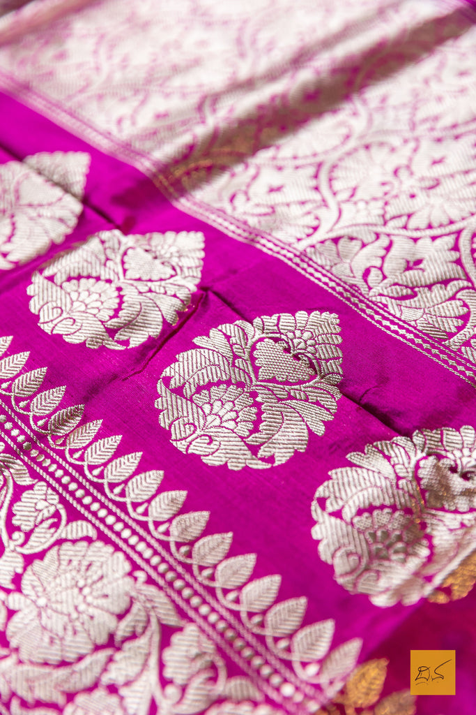 The Vilasini Peacock Blue Banarasi Katan Silk Handwoven Saree is a regal expression of traditional artistry and vibrant elegance. Woven from lustrous Katan silk, the saree features intricate Kadhwa buttas enriched with delicate Meenakari accents, adding subtle pops of color and exquisite detail to the design. The peacock blue body is beautifully contrasted by a bold Khadiyal pink border, lending a striking visual balance to the drape. The pallu, too, is adorned with hints Kadhwa weaving, enhancing its ornate charm. Vilasini is a celebration of fine craftsmanship, perfect for those who appreciate timeless beauty with a vibrant twist.