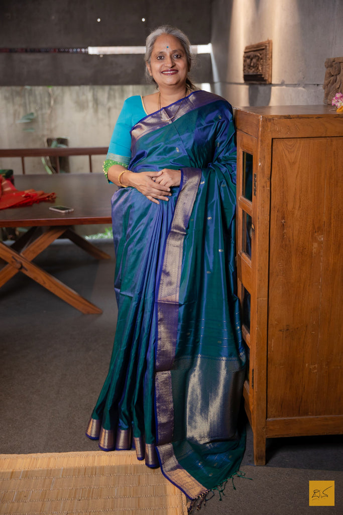 Yamuna- Peacock Blue Maheshwari Pure Silk Handwoven Saree